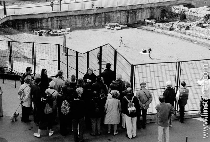 Un groupe de touristes avec leur guide observent un théâtre antique où des acteurs répètent une pièce. Cela donne l'impression d'une visite au zoo.