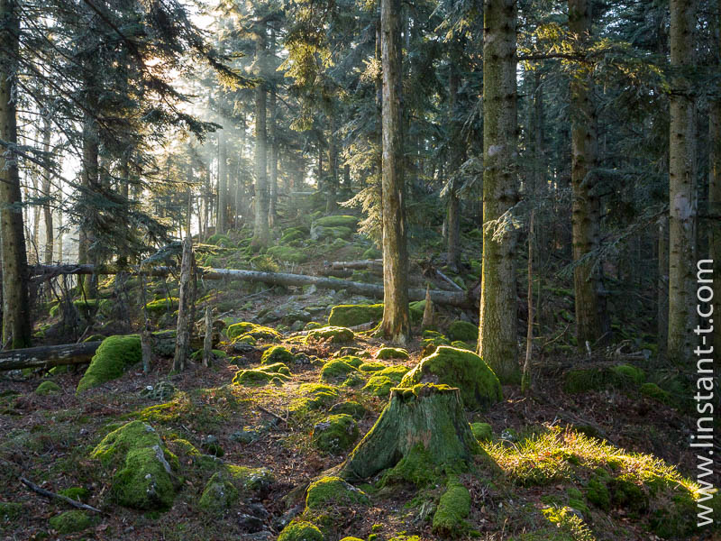 - crête , forêt , hiver , horizontale , matin , Sapin , soleil , souche , Vosges