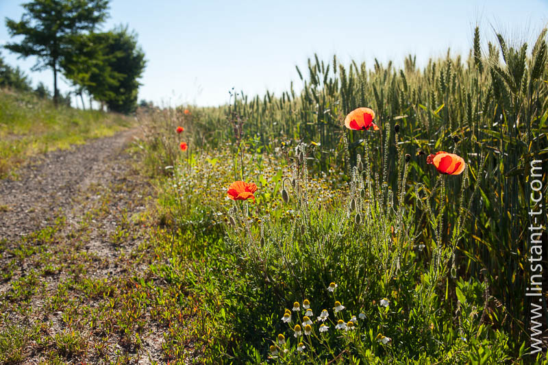 Des Coquelicots entre un chemin et un champ de blé.