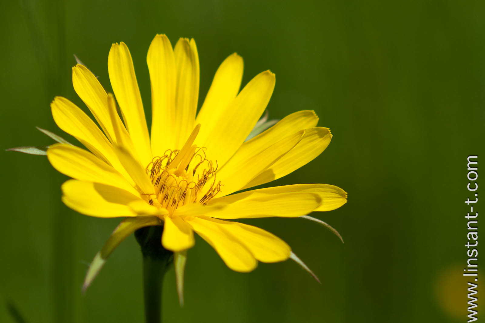 Tige florale glabre, ramifiée à branches raides de 30 à 60 cm . Les feuilles linéaires embrassent longuement la tige très feuillée. Grands capitules de 4 à 6 cm de diamètre, ne s'épanouissant que vers 8 h pour se refermer vers 11 à 14 h.