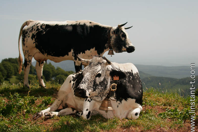 Deux vaches de race Vosgienne dans leur pré. Les collines en arrière-plan.