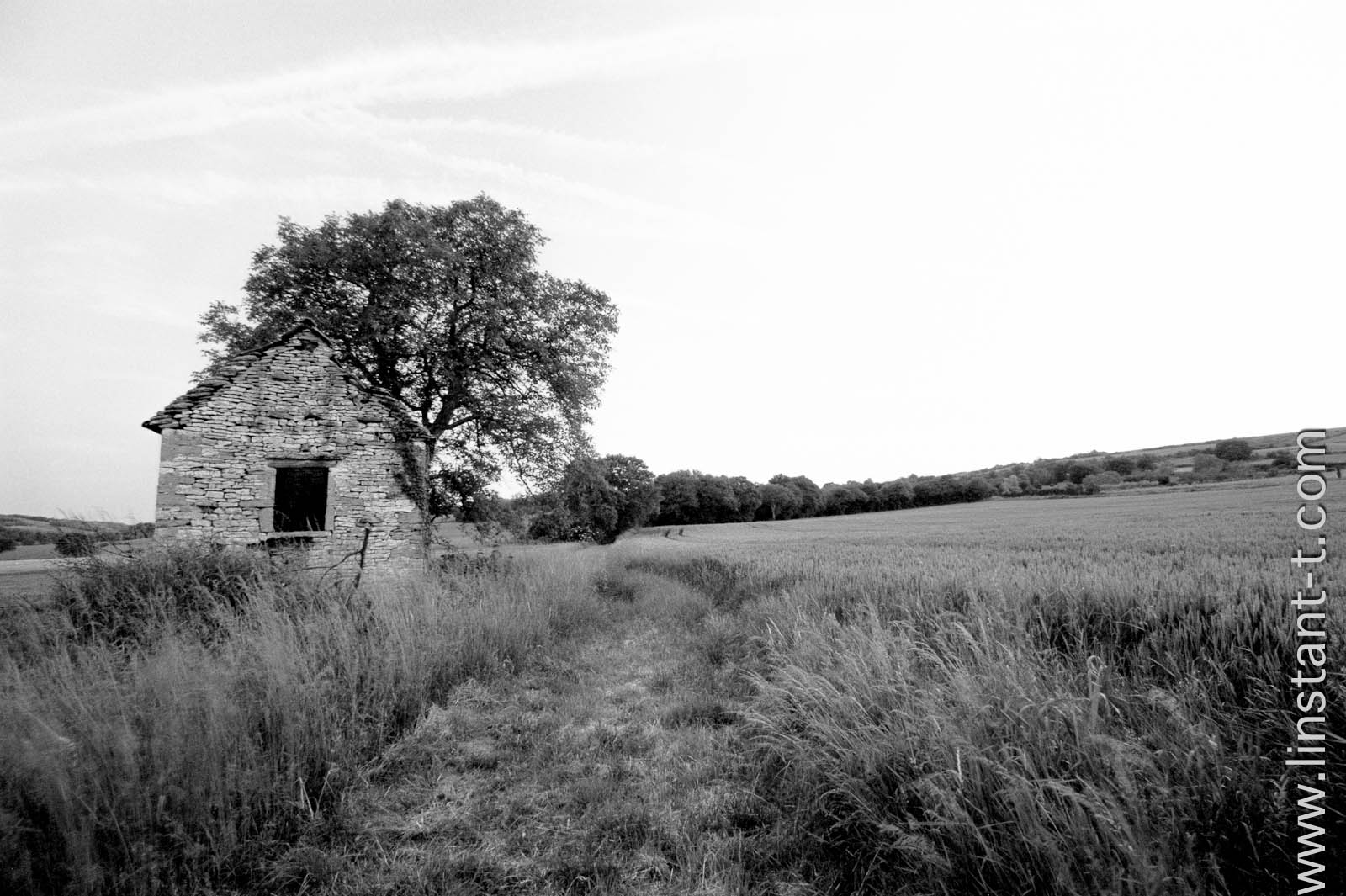 - arbre, champ, horizontale, maison, N&B, noir et blanc, paysage