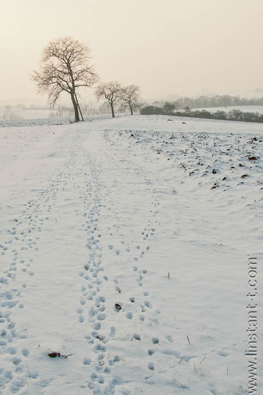 Des traces de chevreuil dans la neige sur un chemin, près de Melsheim. Au loin, un alignement d'arbre dont un avec une échelle de guet.